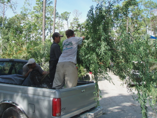 At the sale this morning. A Caesalpinia tree being loaded  Palms etc going north  Copernicia berteroana?  Yup. The prices are understandable. They don't grow fast! Young ones (like mine) can be quite cute. You just have to realize that they'll sneakily transmorgrify into big palms.  Someone brought a big truck, but only bought little stuff that fits in the back seats.  This palm fit!  A bunch of Cuban petticoat palms.  Nice plumeria and some agaves behind  The UF baseball cap crew admiring the spread. Bismarckias behind  And finally, in my own yard today, Aechmea mariae-reginae is putting on a show. It's five years old and was impressive even as an inexpensive pup.